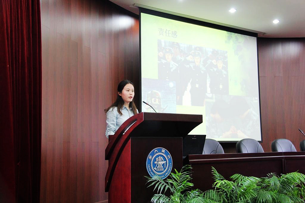 从军营历练归来的大三学生李恬山,从军营生活和品质锻炼两方面向在座同学讲述了自己的军旅经历。她将自己在军队中的点点滴滴汇成了几个关键词,并表示在军队中培养了自身的责任感、荣誉感以及果断坚强、吃苦耐劳的品质,还在时间管理能力、沟通交流能力等方面都得到了锻炼,收获了浓浓的战友情,这一段经历对她来说是人生中宝贵的财富。