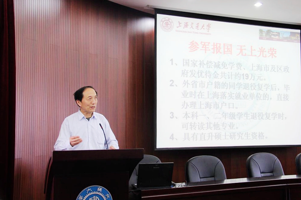 陆建忠向在座的同学介绍了学校历届学生征兵工作的情况和今年的征兵政策。上海交大学生征兵工作自2002年开始已走过了十余年。在这期间,学校向各级部队输送了大批优秀的大学生战士。他们在不同的岗位上严格要求自己,为祖国国防事业挥洒汗水。陆建忠特别介绍了今年的征兵政策,表示在过去的优待政策上,将在奖学金评选等政策上对参军同学有所倾斜,鼓励同学们积极报名,报国强军。